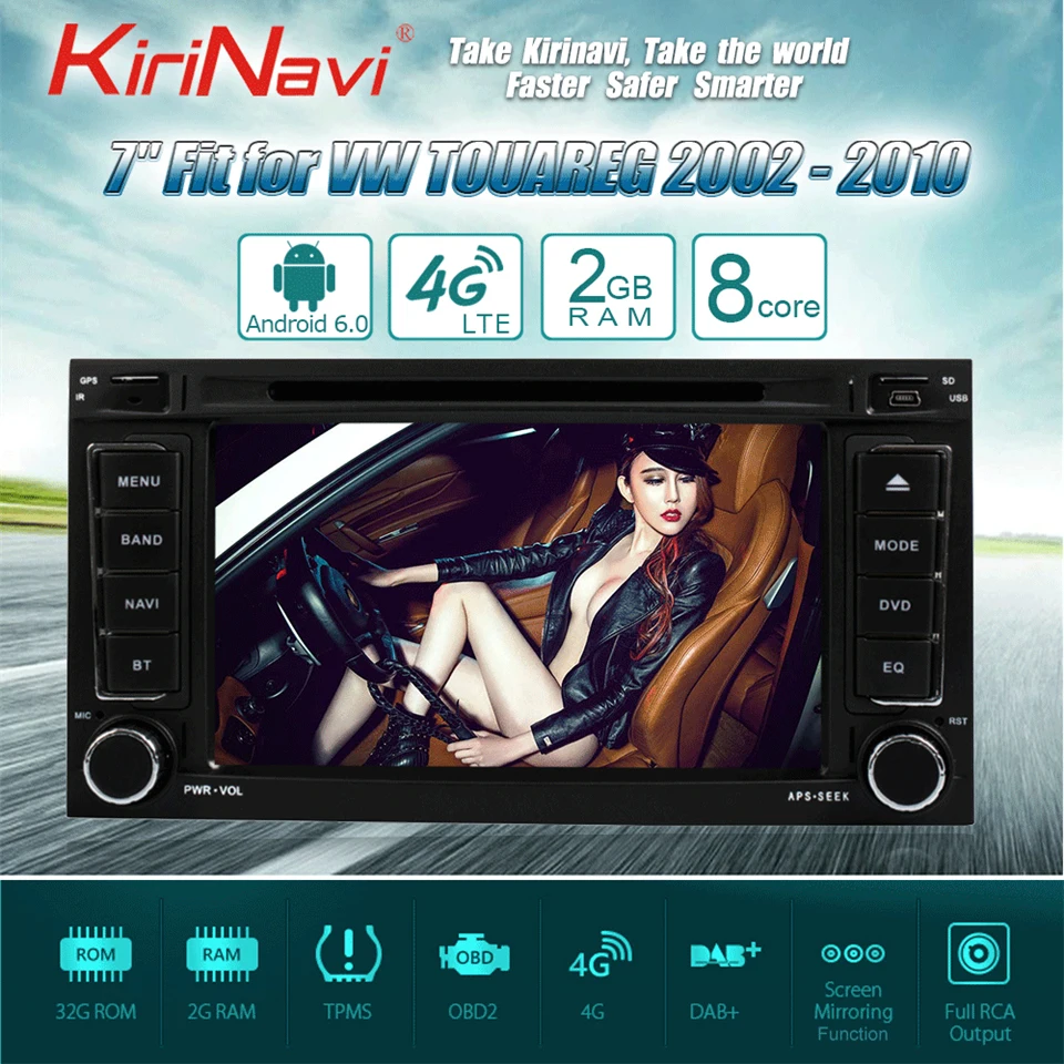 KiriNavi Octa core 4G LET android 7 navigation system for vw touareg multimedia 2002 - 2010 support 4K Video 4G navigation system for vw touareg multimedia Fit for VW Touareg 2002 2003 2004 2005 2006 2007 2008 2009 2010 The Best Car Class Sound Processor:TDA7851 Built-in4G LTE(Just insert SIM card) Pure android 6.0OS,it can be compatible with Google Video format:SupportHD 1080P /4K ScreenResolution:1024*600,Capacitive5PointsMulti-Touch,withDualZonefunction Bluetooth4.0Hand-freephonecall Synchronizecontactlist Built-inWIFIfunction(connecttohotspotfromyoursmartphoneforinternet) Built-inGooglePlayStoreapp,Supporttoinstallnewapplications RAM:DDR32GB,Supportexternal32Gbflashmemory ColorfulLEDbuttons,canbesettoanycolorkeylight Built-inGPSOff-lineMap,andSupportOnlineMap Audiooutput4*50W,EQ:9EqualizersforSound RadioChipNXP6686,AM/FMwithRDS SupportAUX-INAudio,With2 USBport SupportSteeringWheelControl Certification:CEFCCRoHs Voltage:DC12V-14V OSDLanguage:English/Russian/French/German/Spanish/Italian/Arabic/Portuguese/Turkish/Thai/Polish/Hebrewall53language