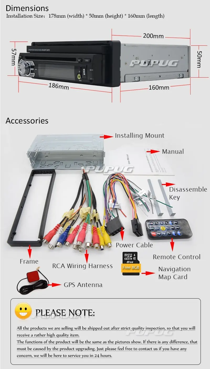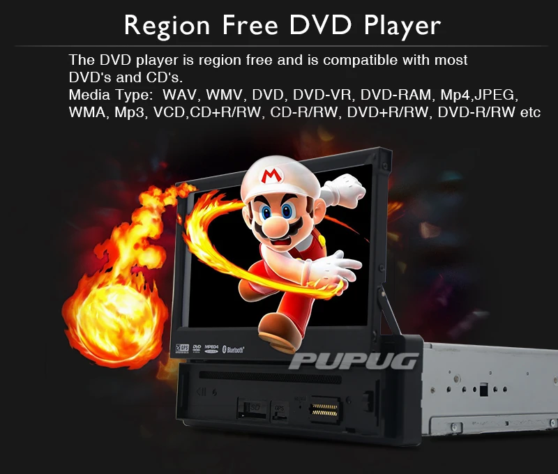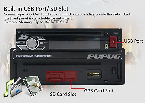 In-Dash Single-DIN 7 inch Motorized Flip-Up Touchscreen Car DVD/CD/USB/SD/MP4/MP3 Player Receiver, Bluetooth, Detachable Front Panel, Wireless Remote Specifications: OS: WinCE Screen Resolution: 800*480 800MHZ CPU / 256M Ram / 128MB Rom Product Dimensions W*L*H (mm): 178*160*50 Type: 1 Din / Singe DIN Functions: Detachable Front Panel: Detachable front panel renders the unit inoperable and deters theft when removed. Built-in GPS navigation:compatible with Top Navigation software, come with Free 8GB GPS Map Card. DVD: Region Free Compatible Formats: AVI/DVD/DVD+R/DVD-R/DVD+RW/DVD-RW/VCD/MP3/CD/CD-RW/JPEG etc. Handsfree Bluetooth: Bluetooth enabled for wireless hands-free calling and speaker listening when paired with a smartphone. Steering Wheel Control: Resistance based analog type only, and help you pay attention to road instead of handing the phone calls. Touchscreen Control 7 inch Digital Touchscreen TFT Widescreen display panel. Slip-Out Touchscreen design, which can be sliding inside the radio. Support Reverse Camera: Support rear camera input, automatically switch to rear camera when reverse the car, avoiding invisible subjects from mirrors. USB/SD: can support USB/SD card up to 16GB Support subwoofer output. Warranty: 1 year What's in the box: GPS antenna x 1, iPod cable x 1, User's manual x 1, Remote control x 1, DVD host x 1, GPS Map x 1,Rear Camera x 1